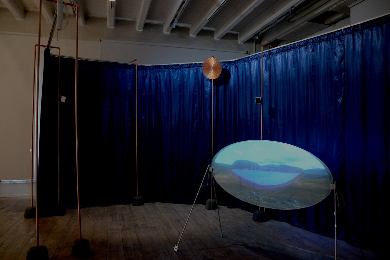 In tm’s installation, the fate of the Stekenjokk mine pit lake becomes a story about the nature of short-sighted processes for resource extraction, yes, but also a contemplation on the notion of endings – how little power we have over them and how they can stretch out in, and through, time. Playing with the idea of a farewell show, Gruvsjön, Berganden och Horisonten presents a musical performance of the song End of the World by Arthur Kent and Lydia Dee (1960), starring three key actors in the story of Stekenjokk: the lake itself, the looming horizon above it and the spirit of the mountain, which has been extracted into resources and shaped into pipes and wires leading the water along. The mine pit lake opens its mouth in song, the horizon and mountain spirit hum along.