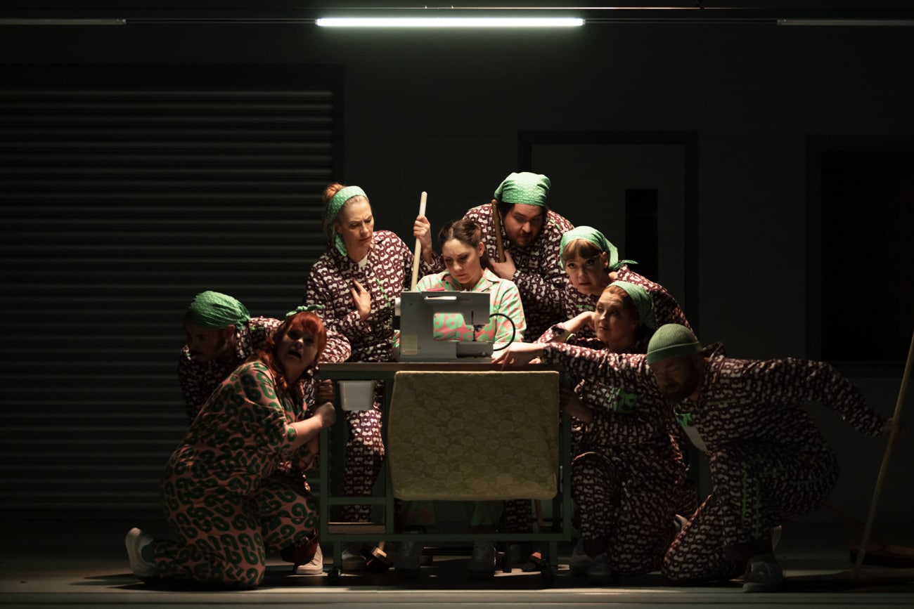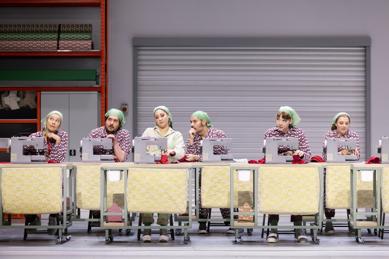 För det första är det viktigt att alla förstår sin plats vid det löpande bandet, understryker regissören. Operan utspelar sig i en stiliserad BH-fabrik och solisterna är en del av kören, det vill säga fabrikens arbetare, klädda i likadana overaller och fångade i samma mönster.
